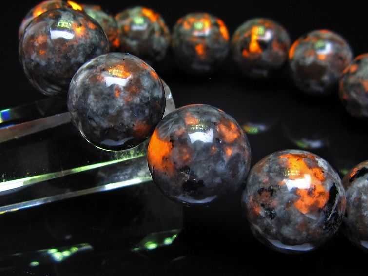 自然光の下では変哲の無い石ですが、ブラックライトなどの紫外線を照射すると強いオレンジ色の蛍光が確認できます。