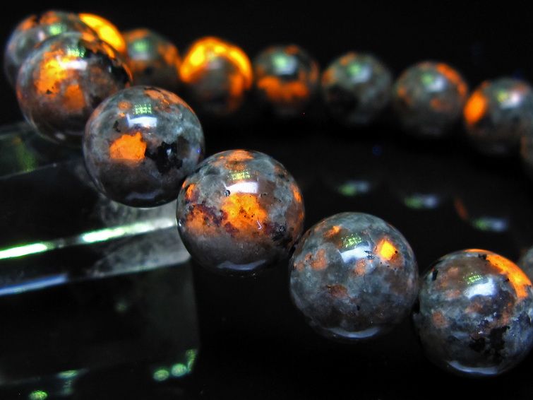 自然光の下では変哲の無い石ですが、ブラックライトなどの紫外線を照射すると強いオレンジ色の蛍光が確認できます。