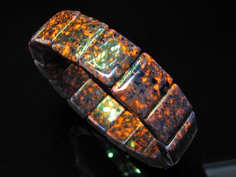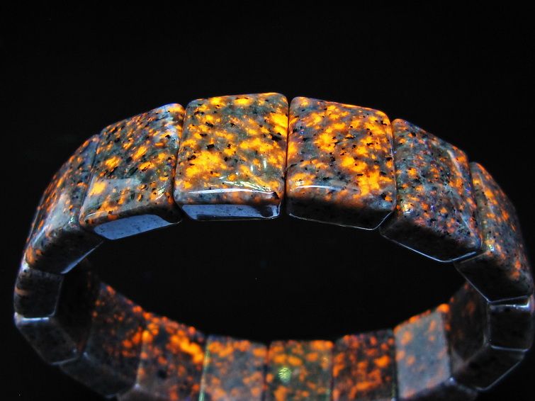 自然光の下では変哲の無い石ですが、ブラックライトなどの紫外線を照射すると強いオレンジ色の蛍光が確認できます。