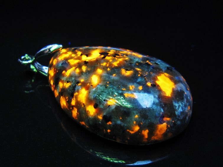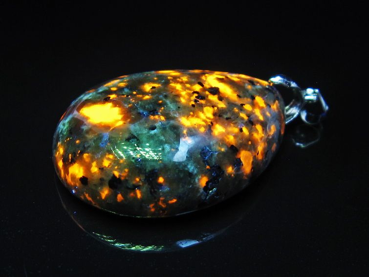 自然光の元では変哲の無い石ですが、ブラックライトなどの紫外線を照射すると強いオレンジ色の蛍光が確認できます。