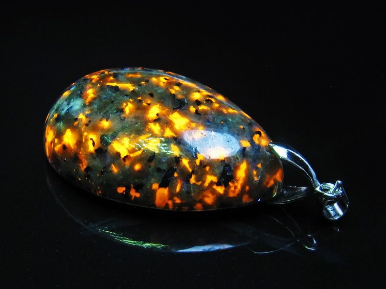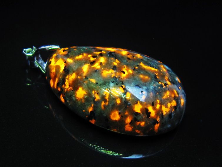 自然光の元では変哲の無い石ですが、ブラックライトなどの紫外線を照射すると強いオレンジ色の蛍光が確認できます。