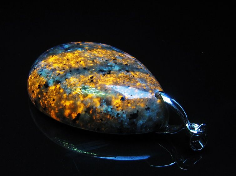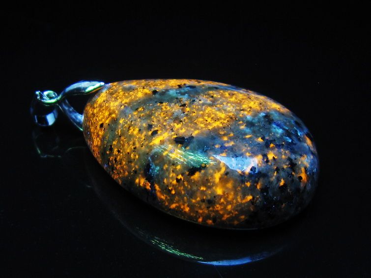 自然光の元では変哲の無い石ですが、ブラックライトなどの紫外線を照射すると強いオレンジ色の蛍光が確認できます。