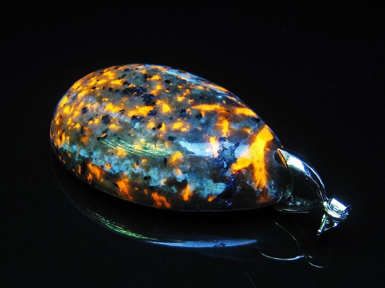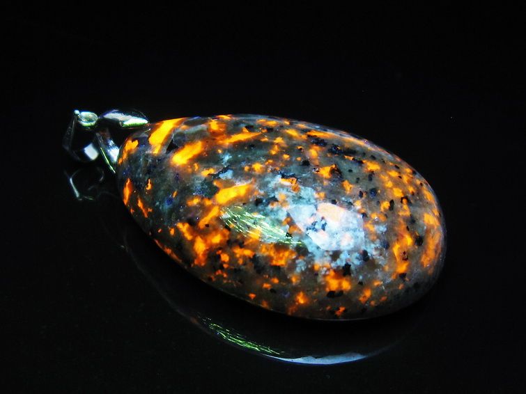 自然光の元では変哲の無い石ですが、ブラックライトなどの紫外線を照射すると強いオレンジ色の蛍光が確認できます。