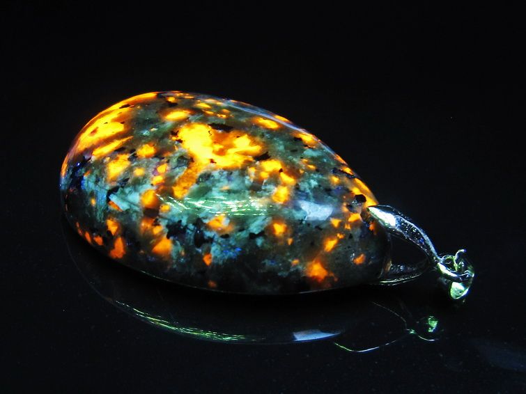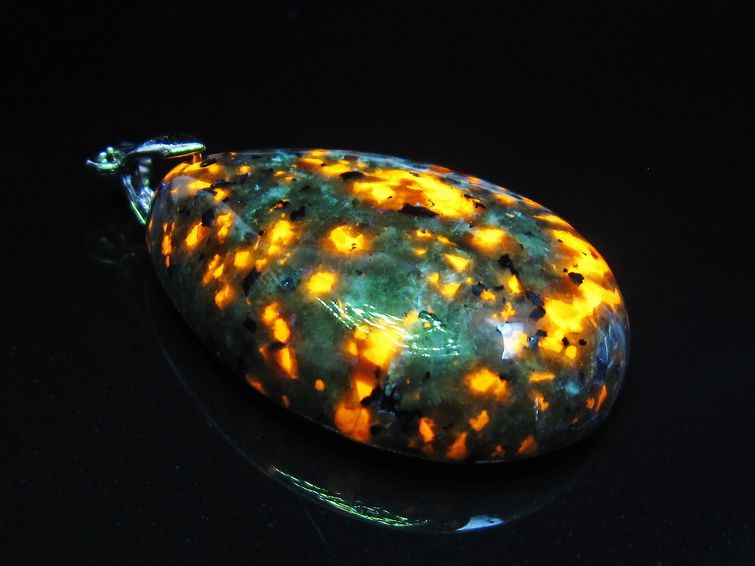 自然光の元では変哲の無い石ですが、ブラックライトなどの紫外線を照射すると強いオレンジ色の蛍光が確認できます。