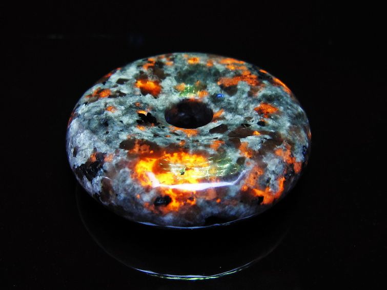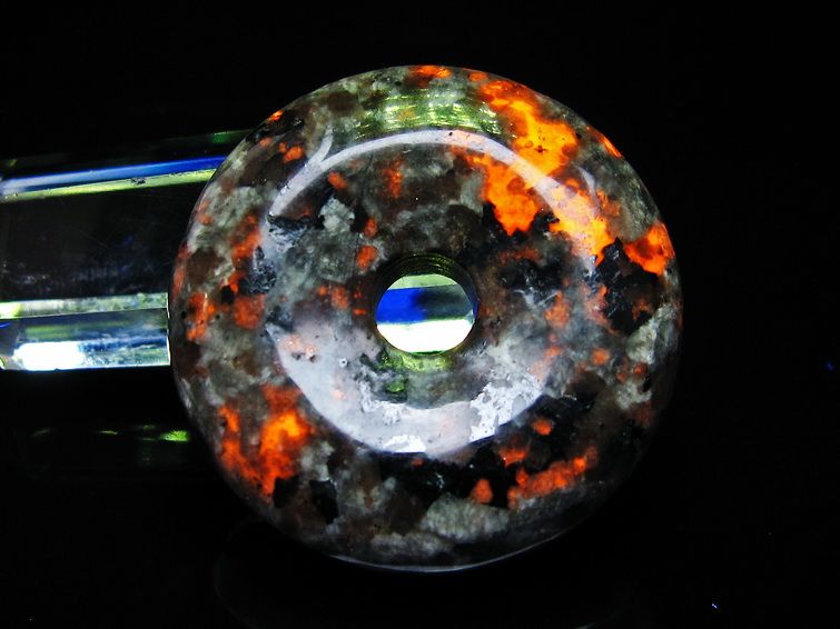 自然光の下では変哲の無い石ですが、ブラックライトなどの紫外線を照射すると強いオレンジ色の蛍光が確認できます。