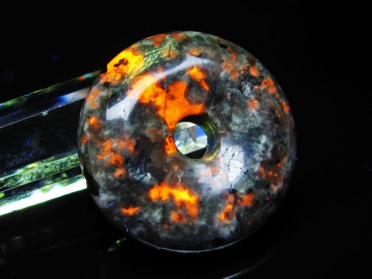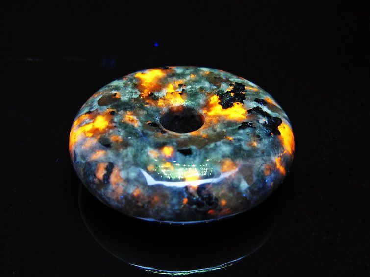 自然光の下では変哲の無い石ですが、ブラックライトなどの紫外線を照射すると強いオレンジ色の蛍光が確認できます。