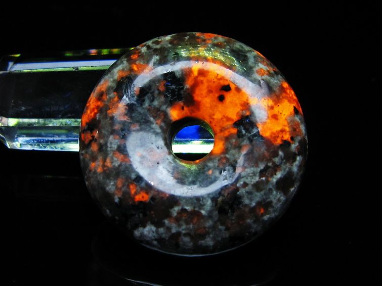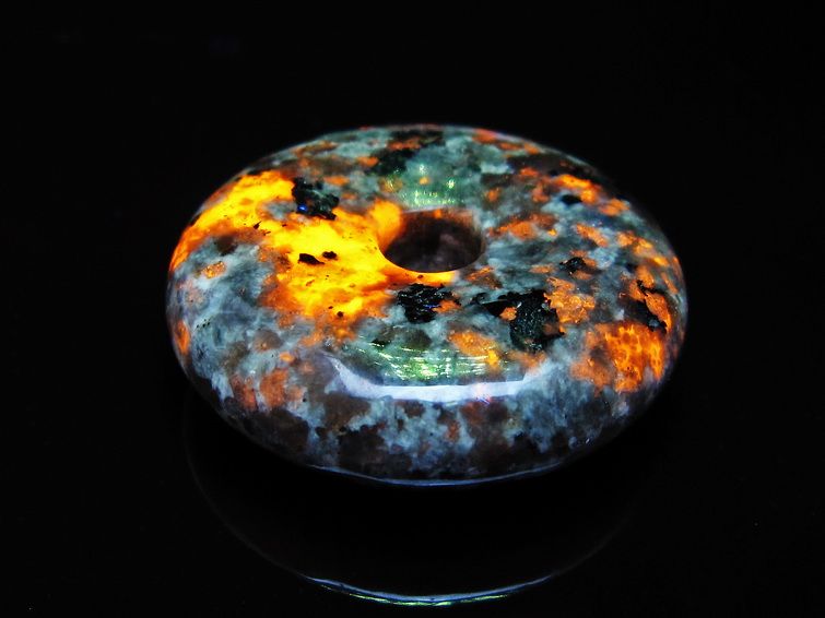 自然光の下では変哲の無い石ですが、ブラックライトなどの紫外線を照射すると強いオレンジ色の蛍光が確認できます。
