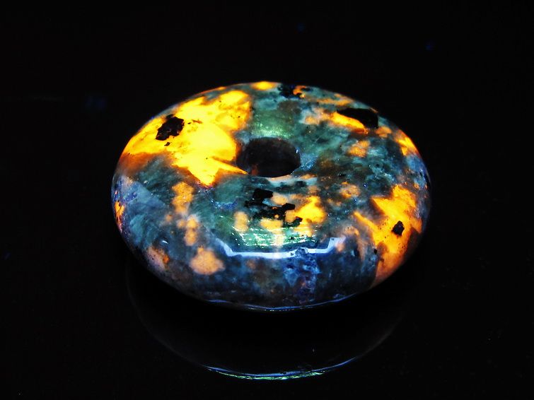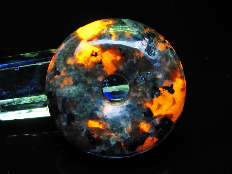 自然光の下では変哲の無い石ですが、ブラックライトなどの紫外線を照射すると強いオレンジ色の蛍光が確認できます。