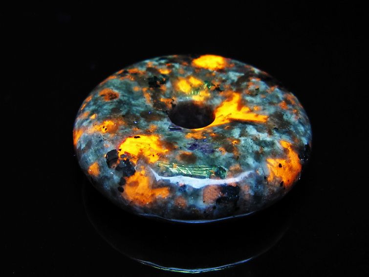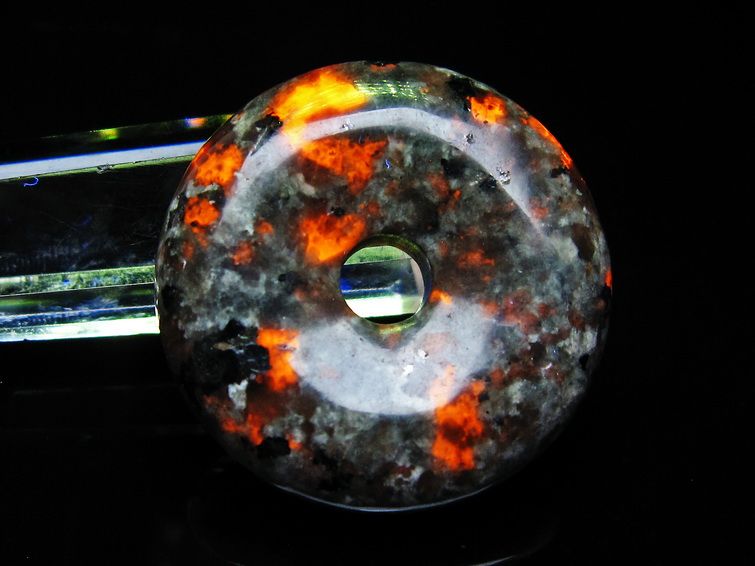 自然光の下では変哲の無い石ですが、ブラックライトなどの紫外線を照射すると強いオレンジ色の蛍光が確認できます。