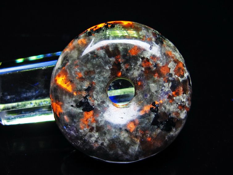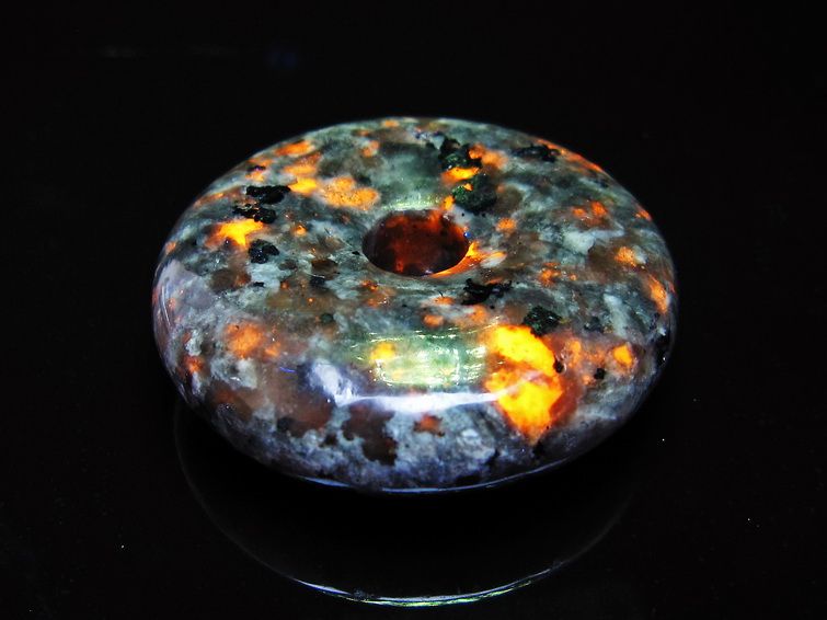 自然光の下では変哲の無い石ですが、ブラックライトなどの紫外線を照射すると強いオレンジ色の蛍光が確認できます。