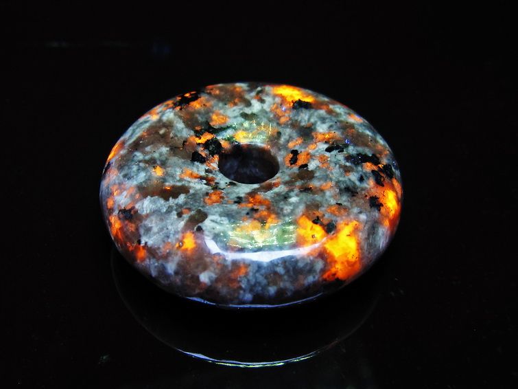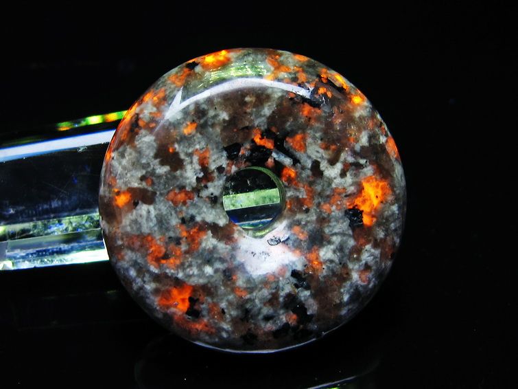 自然光の下では変哲の無い石ですが、ブラックライトなどの紫外線を照射すると強いオレンジ色の蛍光が確認できます。