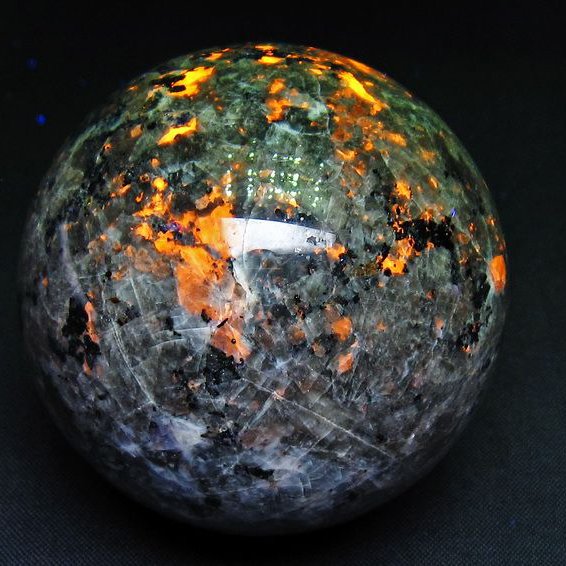 自然光の下では変哲の無い石ですが、ブラックライトなどの紫外線を照射すると強いオレンジ色の蛍光が確認できます。
