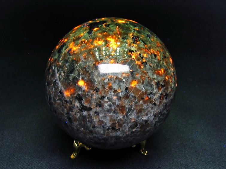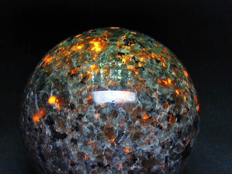 自然光の下では変哲の無い石ですが、ブラックライトなどの紫外線を照射すると強いオレンジ色の蛍光が確認できます。