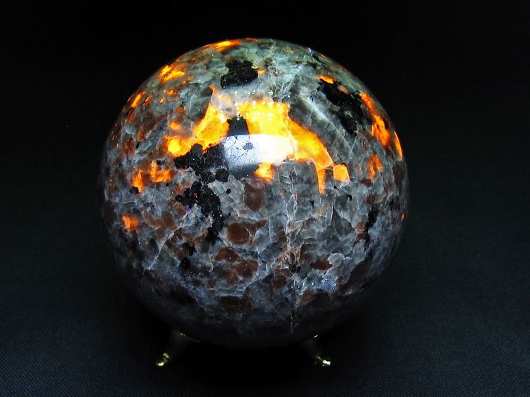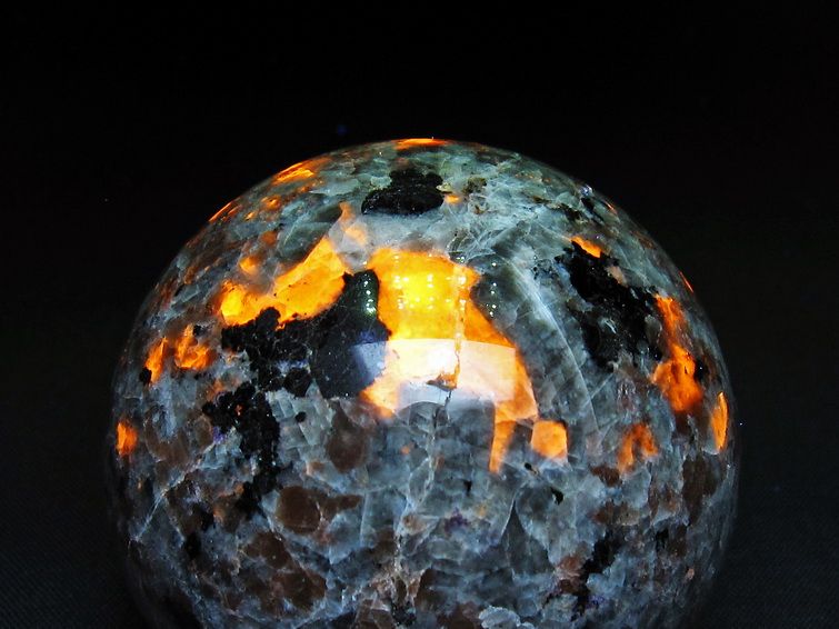 自然光の下では変哲の無い石ですが、ブラックライトなどの紫外線を照射すると強いオレンジ色の蛍光が確認できます。