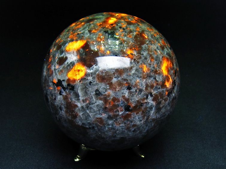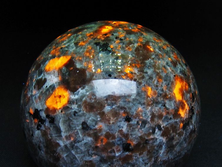 自然光の下では変哲の無い石ですが、ブラックライトなどの紫外線を照射すると強いオレンジ色の蛍光が確認できます。