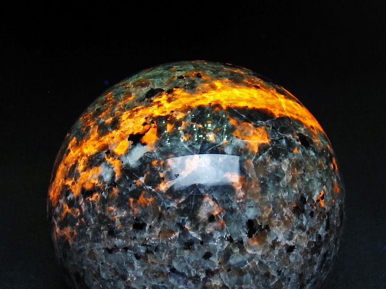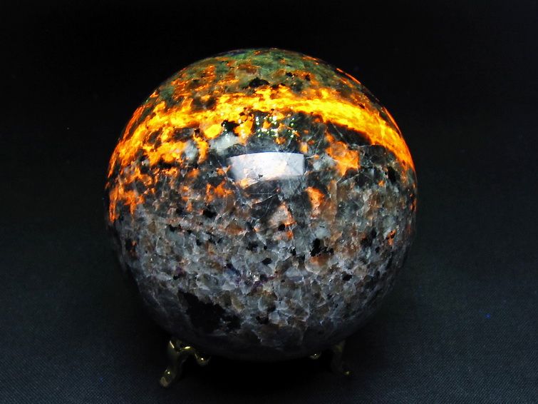 自然光の下では変哲の無い石ですが、ブラックライトなどの紫外線を照射すると強いオレンジ色の蛍光が確認できます。