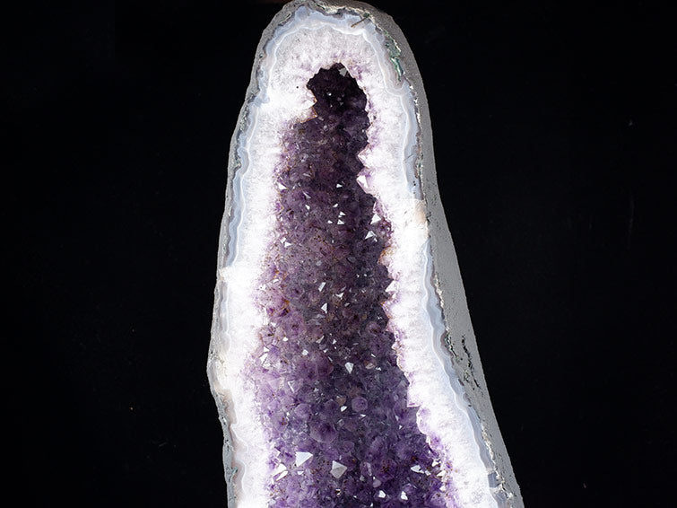 これを半分に切断することで、内部の美しい結晶が見えるドーム型になり、自然の中で偶然に出来た独特な形状と美しさをもつインテリアに最適なパワーストーンです。