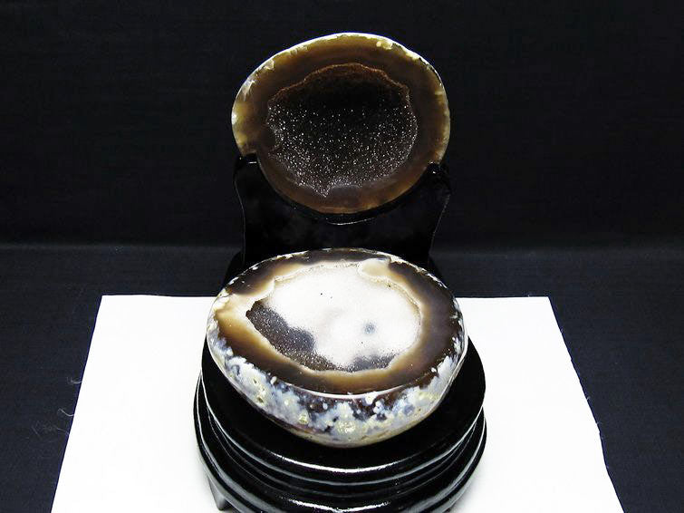 アゲート(瑪瑙)の原石を二つに切ったもので、中には空洞があり、周囲にびっしりと水晶の結晶が並んでいるパワーストーンです。このぽっかりと開いたくぼみ(龍穴)に気が集まるスポットが作り出され、運気上昇に繋がるとされます。龍穴(りゅうけつ)とは、風水における繁栄する土地の事で、龍穴がある場所は天変地異とも無縁であるとされます。
