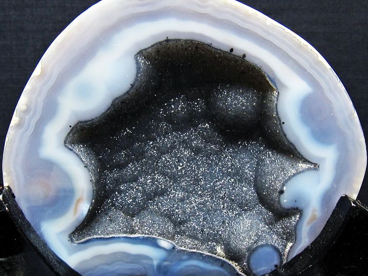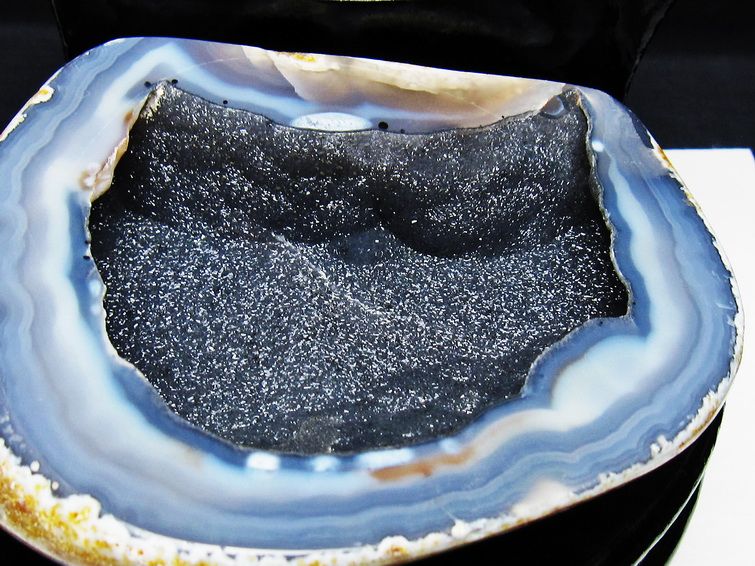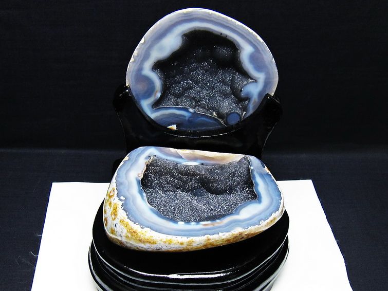 アゲート(瑪瑙)の原石を二つに切ったもので、中には空洞があり、周囲にびっしりと水晶の結晶が並んでいるパワーストーンです。このぽっかりと開いたくぼみ(龍穴)に気が集まるスポットが作り出され、運気上昇に繋がるとされます。龍穴(りゅうけつ)とは、風水における繁栄する土地の事で、龍穴がある場所は天変地異とも無縁であるとされます。