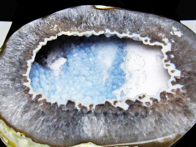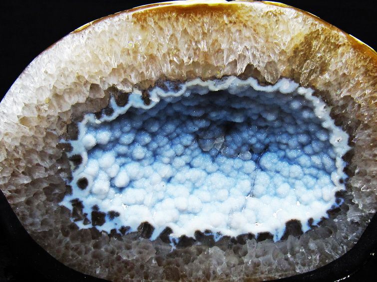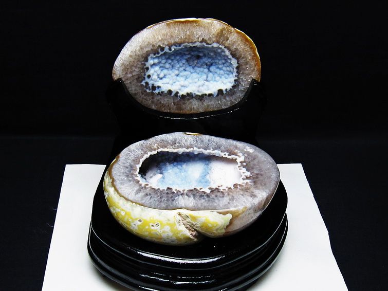 アゲート(瑪瑙)の原石を二つに切ったもので、中には空洞があり、周囲にびっしりと水晶の結晶が並んでいるパワーストーンです。このぽっかりと開いたくぼみ(龍穴)に気が集まるスポットが作り出され、運気上昇に繋がるとされます。龍穴(りゅうけつ)とは、風水における繁栄する土地の事で、龍穴がある場所は天変地異とも無縁であるとされます。