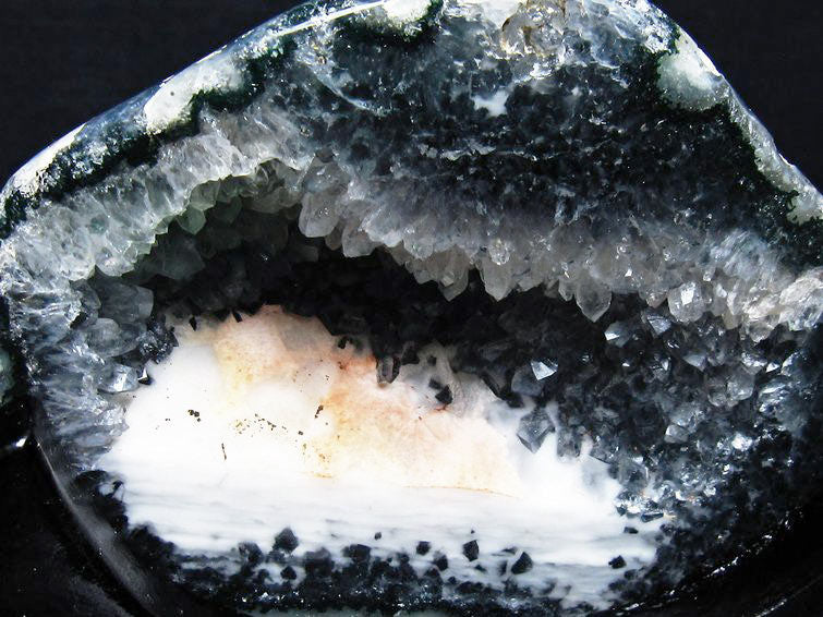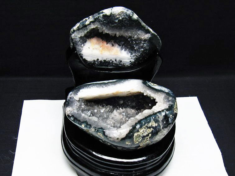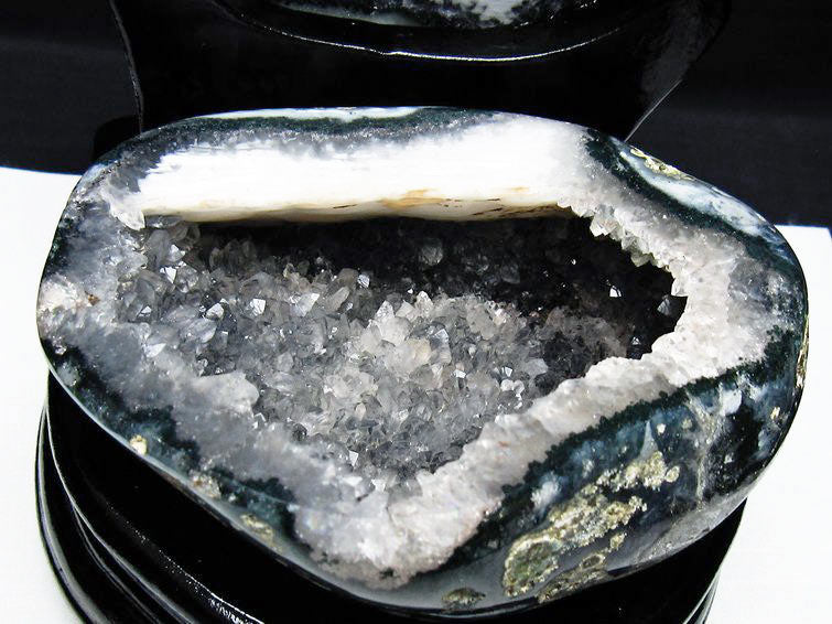 アゲート(瑪瑙)の原石を二つに切ったもので、中には空洞があり、周囲にびっしりと水晶の結晶が並んでいるパワーストーンです。このぽっかりと開いたくぼみ(龍穴)に気が集まるスポットが作り出され、運気上昇に繋がるとされます。龍穴(りゅうけつ)とは、風水における繁栄する土地の事で、龍穴がある場所は天変地異とも無縁であるとされます。