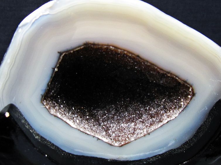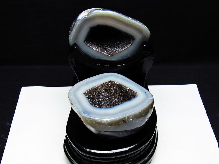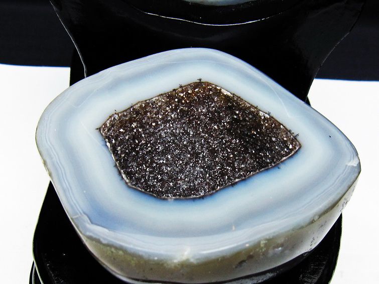 アゲート(瑪瑙)の原石を二つに切ったもので、中には空洞があり、周囲にびっしりと水晶の結晶が並んでいるパワーストーンです。このぽっかりと開いたくぼみ(龍穴)に気が集まるスポットが作り出され、運気上昇に繋がるとされます。龍穴(りゅうけつ)とは、風水における繁栄する土地の事で、龍穴がある場所は天変地異とも無縁であるとされます。