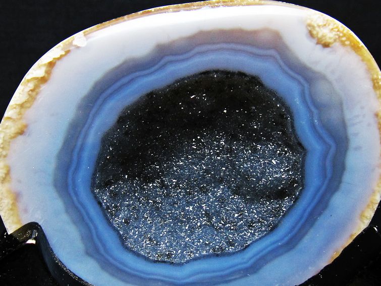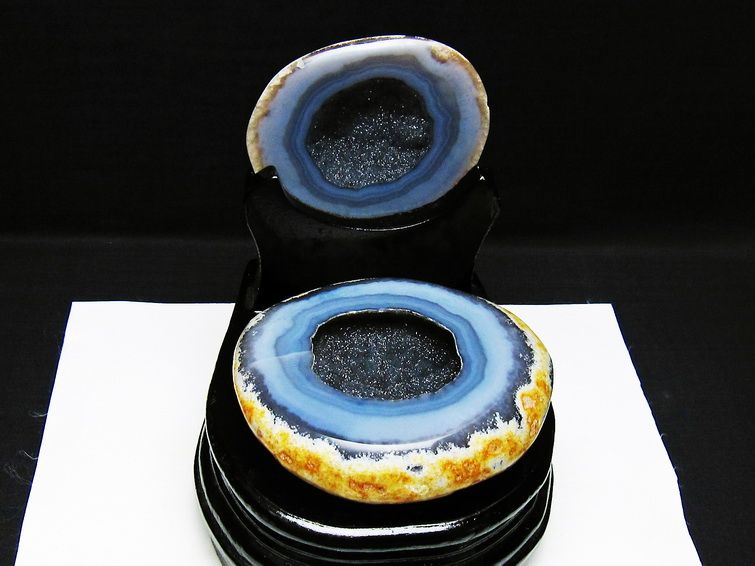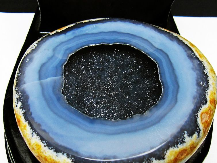 アゲート(瑪瑙)の原石を二つに切ったもので、中には空洞があり、周囲にびっしりと水晶の結晶が並んでいるパワーストーンです。このぽっかりと開いたくぼみ(龍穴)に気が集まるスポットが作り出され、運気上昇に繋がるとされます。龍穴(りゅうけつ)とは、風水における繁栄する土地の事で、龍穴がある場所は天変地異とも無縁であるとされます。