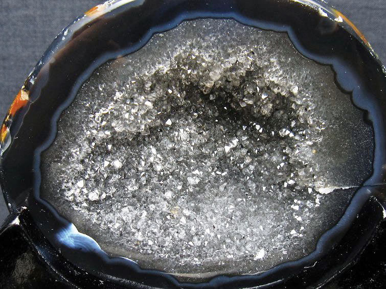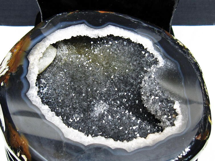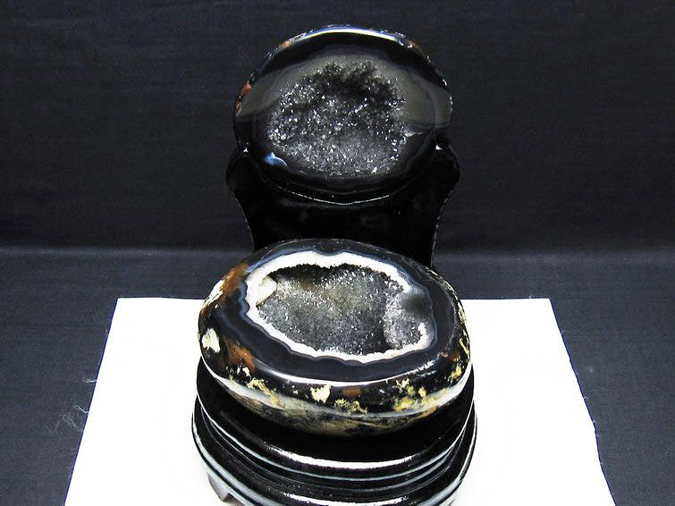 アゲート(瑪瑙)の原石を二つに切ったもので、中には空洞があり、周囲にびっしりと水晶の結晶が並んでいるパワーストーンです。このぽっかりと開いたくぼみ(龍穴)に気が集まるスポットが作り出され、運気上昇に繋がるとされます。龍穴(りゅうけつ)とは、風水における繁栄する土地の事で、龍穴がある場所は天変地異とも無縁であるとされます。