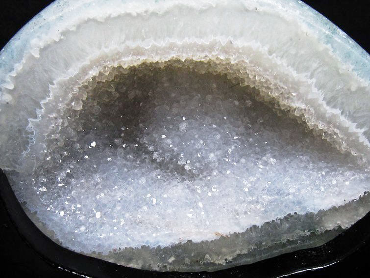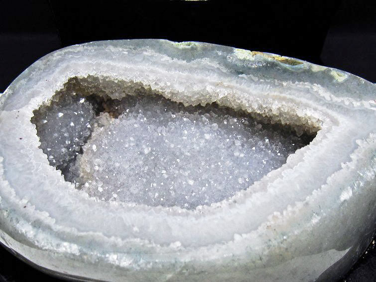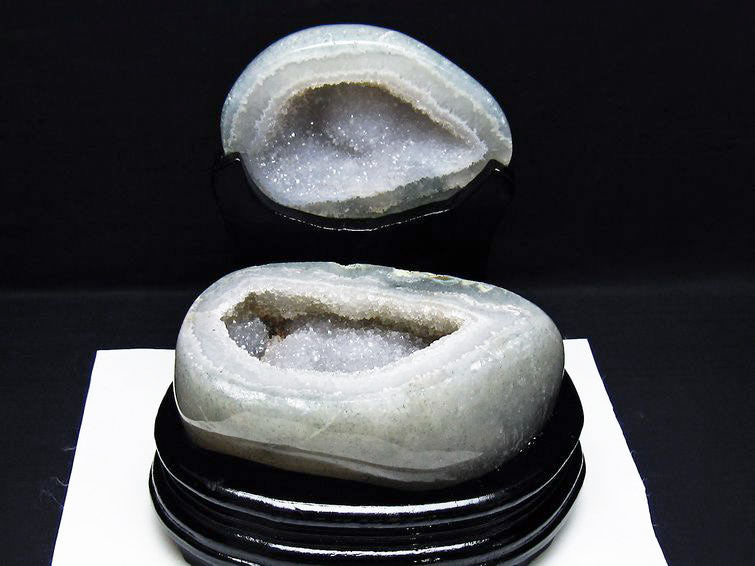 アゲート(瑪瑙)の原石を二つに切ったもので、中には空洞があり、周囲にびっしりと水晶の結晶が並んでいるパワーストーンです。このぽっかりと開いたくぼみ(龍穴)に気が集まるスポットが作り出され、運気上昇に繋がるとされます。龍穴(りゅうけつ)とは、風水における繁栄する土地の事で、龍穴がある場所は天変地異とも無縁であるとされます。