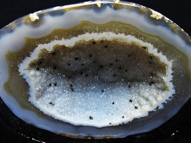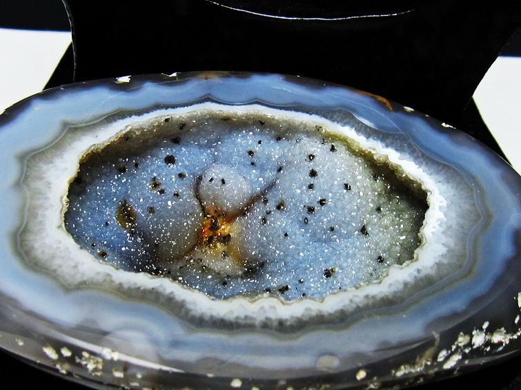 アゲート(瑪瑙)の原石を二つに切ったもので、中には空洞があり、周囲にびっしりと水晶の結晶が並んでいるパワーストーンです。このぽっかりと開いたくぼみ(龍穴)に気が集まるスポットが作り出され、運気上昇に繋がるとされます。龍穴(りゅうけつ)とは、風水における繁栄する土地の事で、龍穴がある場所は天変地異とも無縁であるとされます。