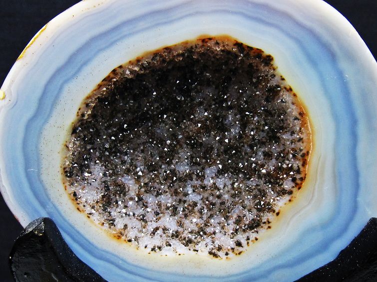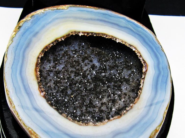 アゲート(瑪瑙)の原石を二つに切ったもので、中には空洞があり、周囲にびっしりと水晶の結晶が並んでいるパワーストーンです。このぽっかりと開いたくぼみ(龍穴)に気が集まるスポットが作り出され、運気上昇に繋がるとされます。龍穴(りゅうけつ)とは、風水における繁栄する土地の事で、龍穴がある場所は天変地異とも無縁であるとされます。