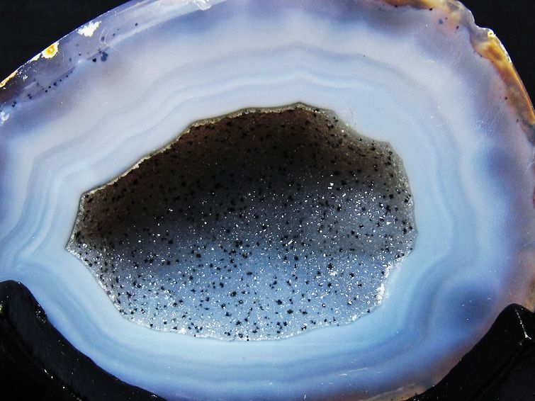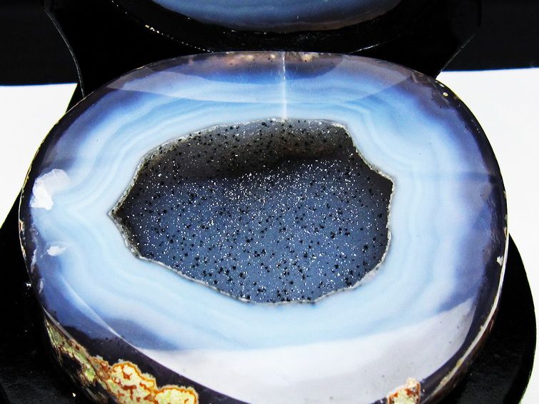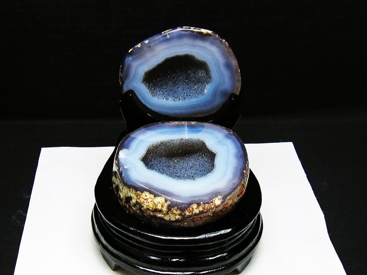 アゲート(瑪瑙)の原石を二つに切ったもので、中には空洞があり、周囲にびっしりと水晶の結晶が並んでいるパワーストーンです。このぽっかりと開いたくぼみ(龍穴)に気が集まるスポットが作り出され、運気上昇に繋がるとされます。龍穴(りゅうけつ)とは、風水における繁栄する土地の事で、龍穴がある場所は天変地異とも無縁であるとされます。