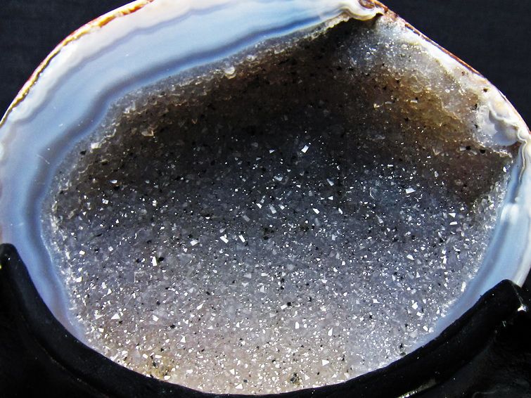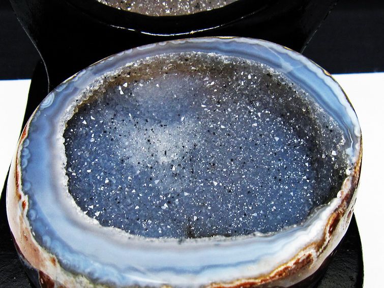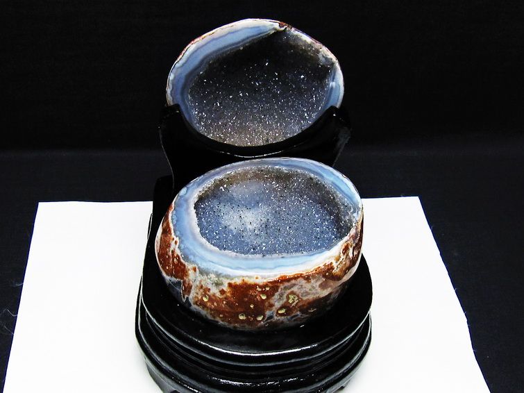 アゲート(瑪瑙)の原石を二つに切ったもので、中には空洞があり、周囲にびっしりと水晶の結晶が並んでいるパワーストーンです。このぽっかりと開いたくぼみ(龍穴)に気が集まるスポットが作り出され、運気上昇に繋がるとされます。龍穴(りゅうけつ)とは、風水における繁栄する土地の事で、龍穴がある場所は天変地異とも無縁であるとされます。
