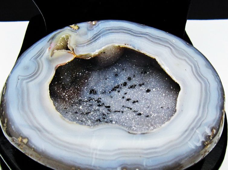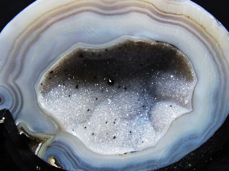 アゲート(瑪瑙)の原石を二つに切ったもので、中には空洞があり、周囲にびっしりと水晶の結晶が並んでいるパワーストーンです。このぽっかりと開いたくぼみ(龍穴)に気が集まるスポットが作り出され、運気上昇に繋がるとされます。龍穴(りゅうけつ)とは、風水における繁栄する土地の事で、龍穴がある場所は天変地異とも無縁であるとされます。