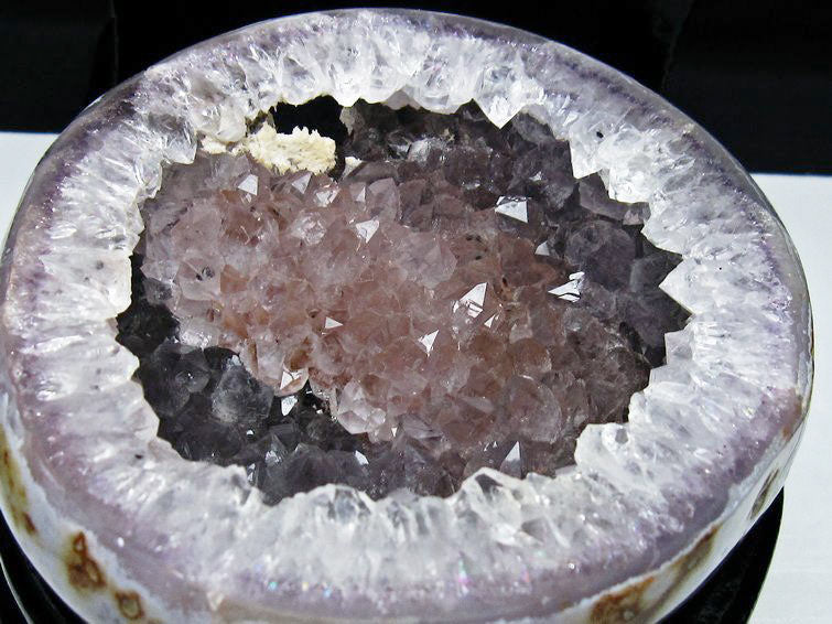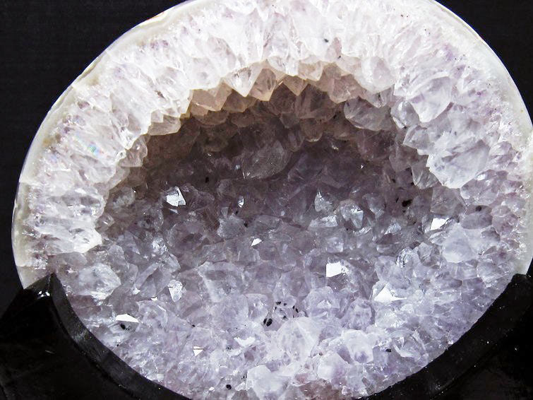 アゲート(瑪瑙)の原石を二つに切ったもので、中には空洞があり、周囲にびっしりと水晶の結晶が並んでいるパワーストーンです。このぽっかりと開いたくぼみ(龍穴)に気が集まるスポットが作り出され、運気上昇に繋がるとされます。龍穴(りゅうけつ)とは、風水における繁栄する土地の事で、龍穴がある場所は天変地異とも無縁であるとされます。