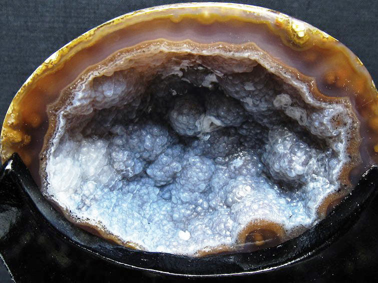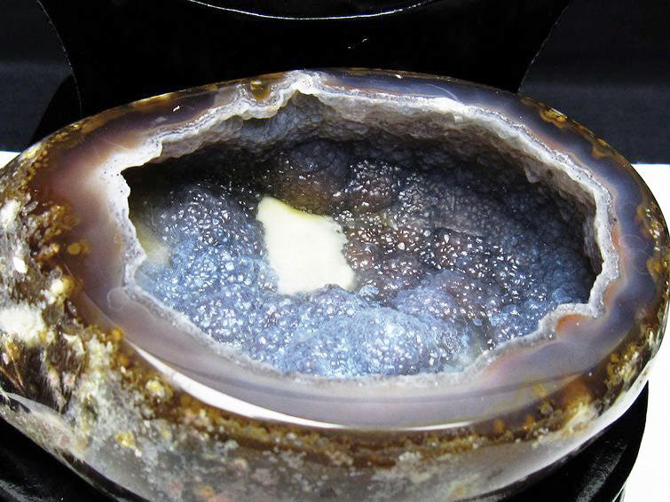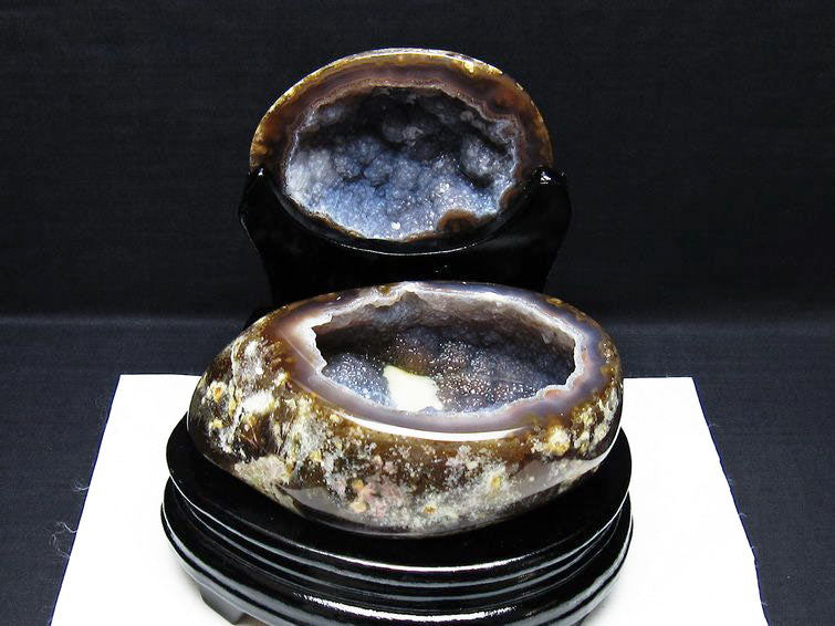 アゲート(瑪瑙)の原石を二つに切ったもので、中には空洞があり、周囲にびっしりと水晶の結晶が並んでいるパワーストーンです。このぽっかりと開いたくぼみ(龍穴)に気が集まるスポットが作り出され、運気上昇に繋がるとされます。龍穴(りゅうけつ)とは、風水における繁栄する土地の事で、龍穴がある場所は天変地異とも無縁であるとされます。