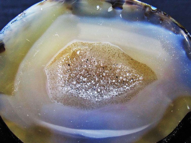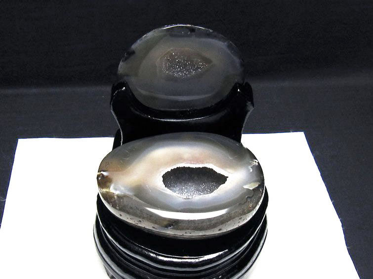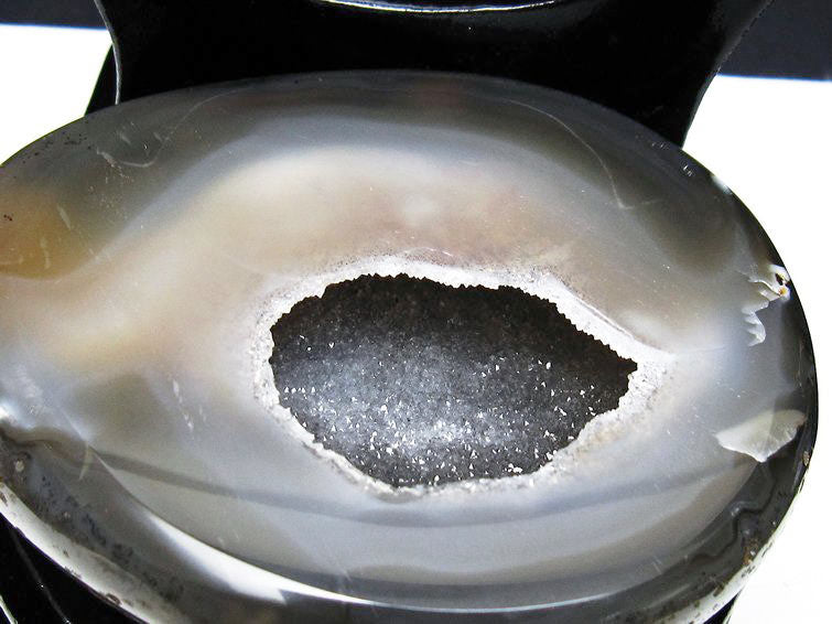 アゲート(瑪瑙)の原石を二つに切ったもので、中には空洞があり、周囲にびっしりと水晶の結晶が並んでいるパワーストーンです。このぽっかりと開いたくぼみ(龍穴)に気が集まるスポットが作り出され、運気上昇に繋がるとされます。龍穴(りゅうけつ)とは、風水における繁栄する土地の事で、龍穴がある場所は天変地異とも無縁であるとされます。