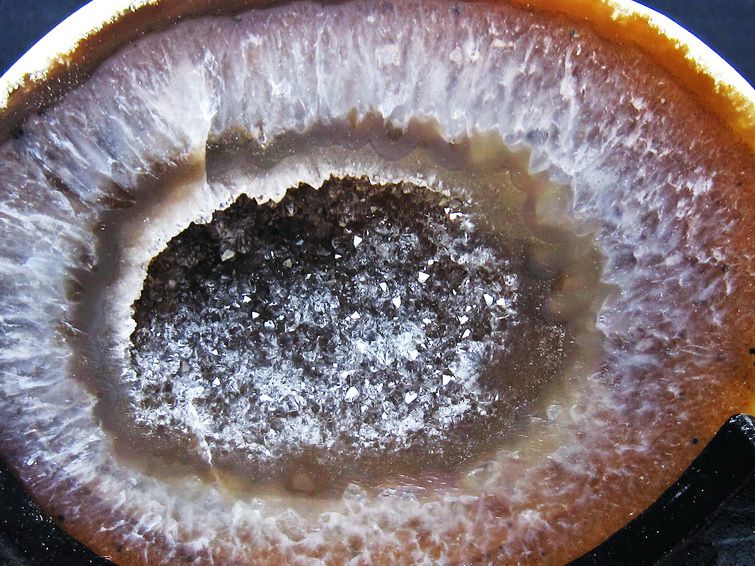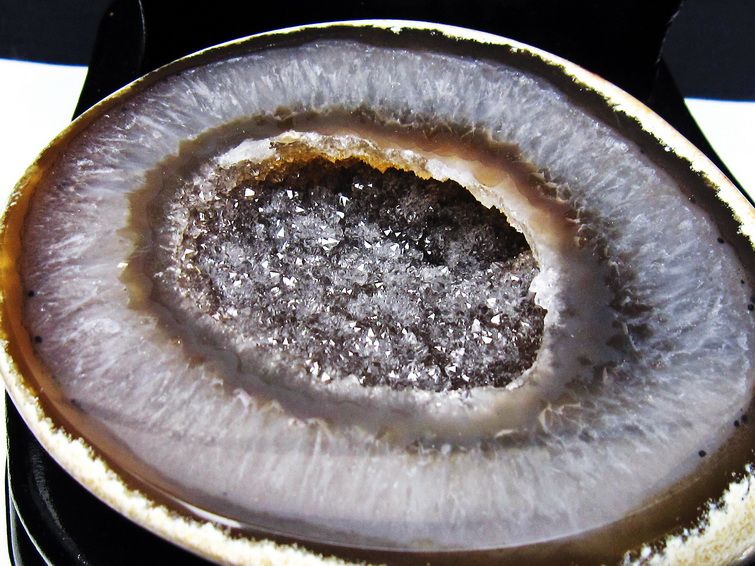 アゲート(瑪瑙)の原石を二つに切ったもので、中には空洞があり、周囲にびっしりと水晶の結晶が並んでいるパワーストーンです。このぽっかりと開いたくぼみ(龍穴)に気が集まるスポットが作り出され、運気上昇に繋がるとされます。龍穴(りゅうけつ)とは、風水における繁栄する土地の事で、龍穴がある場所は天変地異とも無縁であるとされます。