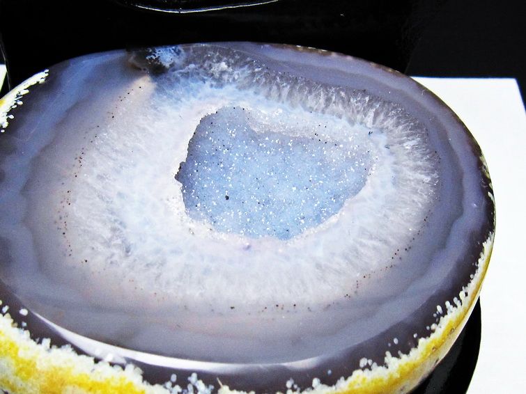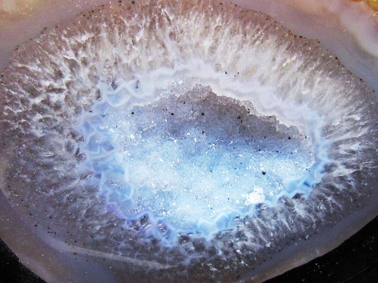 アゲート(瑪瑙)の原石を二つに切ったもので、中には空洞があり、周囲にびっしりと水晶の結晶が並んでいるパワーストーンです。このぽっかりと開いたくぼみ(龍穴)に気が集まるスポットが作り出され、運気上昇に繋がるとされます。龍穴(りゅうけつ)とは、風水における繁栄する土地の事で、龍穴がある場所は天変地異とも無縁であるとされます。