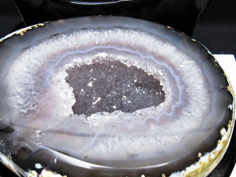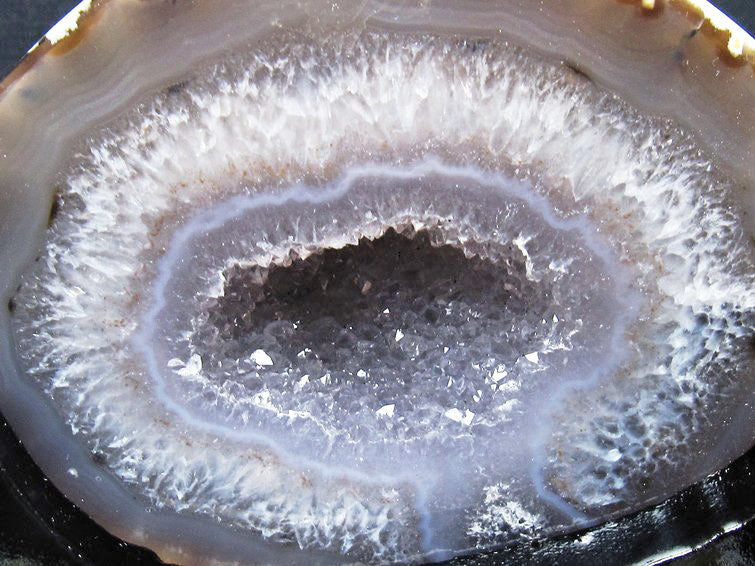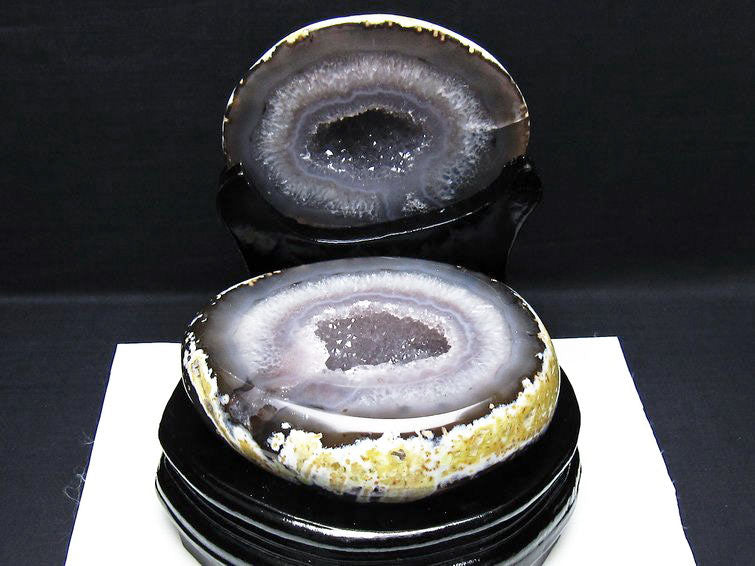 アゲート(瑪瑙)の原石を二つに切ったもので、中には空洞があり、周囲にびっしりと水晶の結晶が並んでいるパワーストーンです。このぽっかりと開いたくぼみ(龍穴)に気が集まるスポットが作り出され、運気上昇に繋がるとされます。龍穴(りゅうけつ)とは、風水における繁栄する土地の事で、龍穴がある場所は天変地異とも無縁であるとされます。