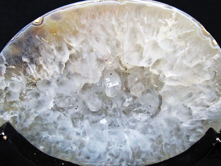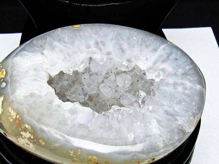 アゲート(瑪瑙)の原石を二つに切ったもので、中には空洞があり、周囲にびっしりと水晶の結晶が並んでいるパワーストーンです。このぽっかりと開いたくぼみ(龍穴)に気が集まるスポットが作り出され、運気上昇に繋がるとされます。龍穴(りゅうけつ)とは、風水における繁栄する土地の事で、龍穴がある場所は天変地異とも無縁であるとされます。