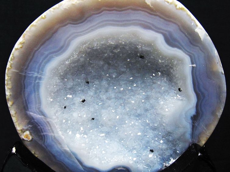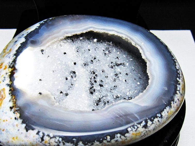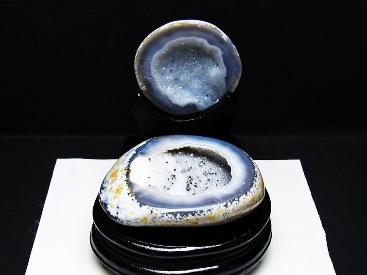 アゲート(瑪瑙)の原石を二つに切ったもので、中には空洞があり、周囲にびっしりと水晶の結晶が並んでいるパワーストーンです。このぽっかりと開いたくぼみ(龍穴)に気が集まるスポットが作り出され、運気上昇に繋がるとされます。龍穴(りゅうけつ)とは、風水における繁栄する土地の事で、龍穴がある場所は天変地異とも無縁であるとされます。