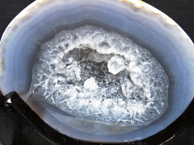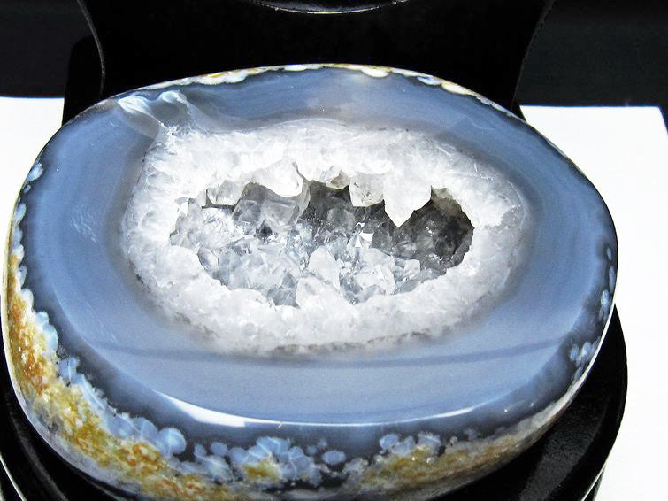 アゲート(瑪瑙)の原石を二つに切ったもので、中には空洞があり、周囲にびっしりと水晶の結晶が並んでいるパワーストーンです。このぽっかりと開いたくぼみ(龍穴)に気が集まるスポットが作り出され、運気上昇に繋がるとされます。龍穴(りゅうけつ)とは、風水における繁栄する土地の事で、龍穴がある場所は天変地異とも無縁であるとされます。