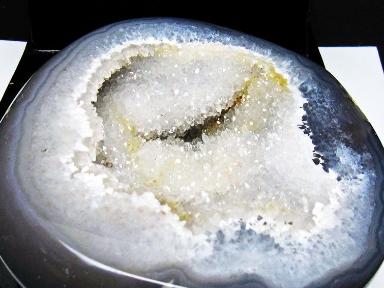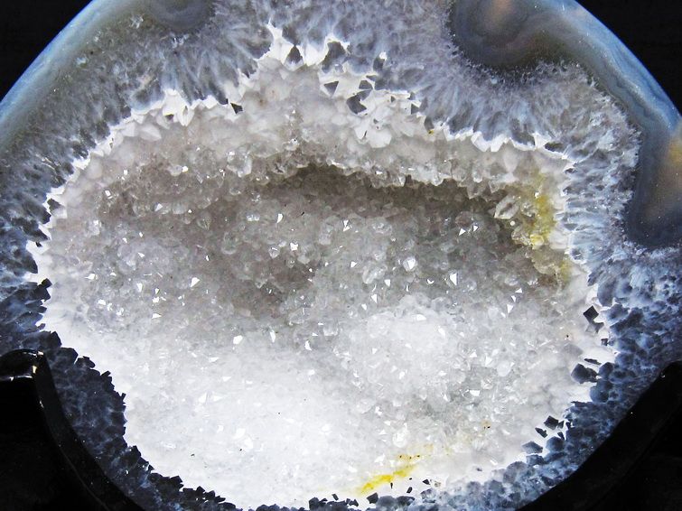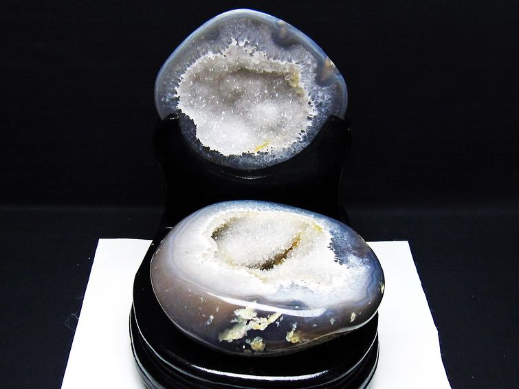 アゲート(瑪瑙)の原石を二つに切ったもので、中には空洞があり、周囲にびっしりと水晶の結晶が並んでいるパワーストーンです。このぽっかりと開いたくぼみ(龍穴)に気が集まるスポットが作り出され、運気上昇に繋がるとされます。龍穴(りゅうけつ)とは、風水における繁栄する土地の事で、龍穴がある場所は天変地異とも無縁であるとされます。