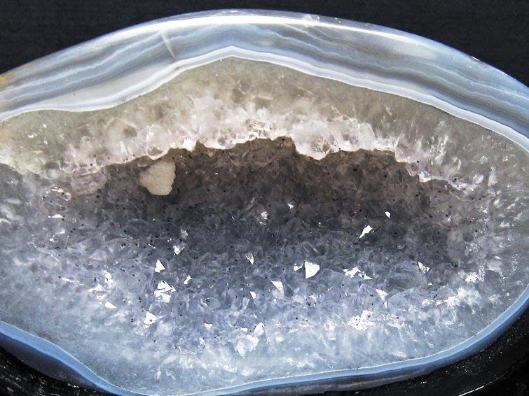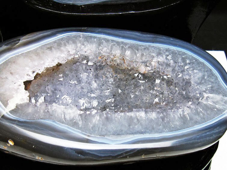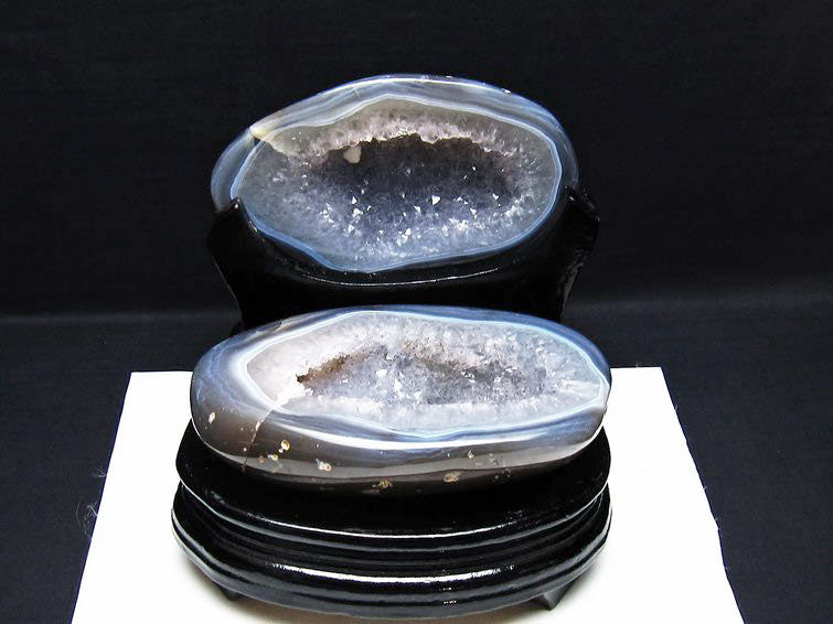 アゲート(瑪瑙)の原石を二つに切ったもので、中には空洞があり、周囲にびっしりと水晶の結晶が並んでいるパワーストーンです。このぽっかりと開いたくぼみ(龍穴)に気が集まるスポットが作り出され、運気上昇に繋がるとされます。龍穴(りゅうけつ)とは、風水における繁栄する土地の事で、龍穴がある場所は天変地異とも無縁であるとされます。