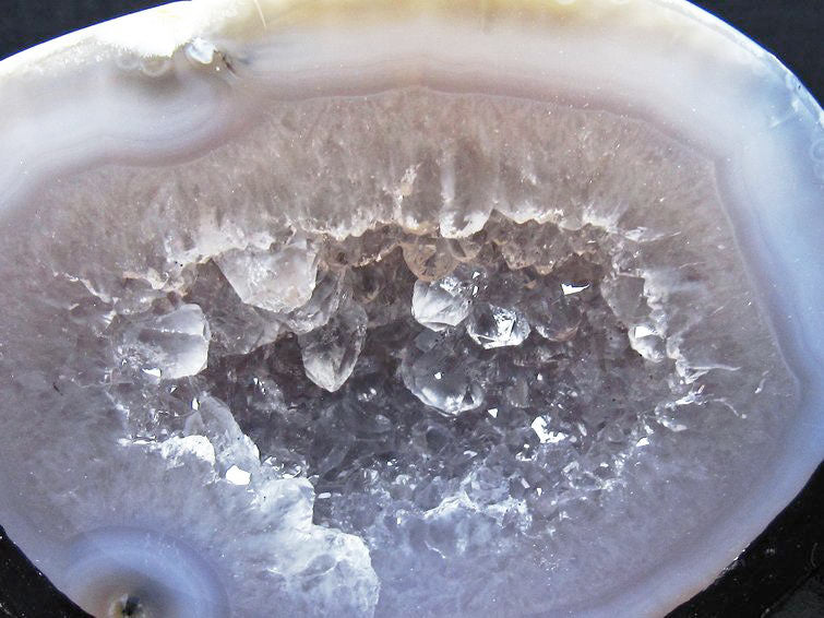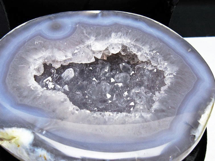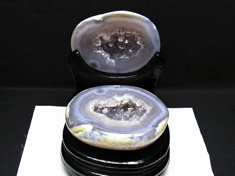 アゲート(瑪瑙)の原石を二つに切ったもので、中には空洞があり、周囲にびっしりと水晶の結晶が並んでいるパワーストーンです。このぽっかりと開いたくぼみ(龍穴)に気が集まるスポットが作り出され、運気上昇に繋がるとされます。龍穴(りゅうけつ)とは、風水における繁栄する土地の事で、龍穴がある場所は天変地異とも無縁であるとされます。