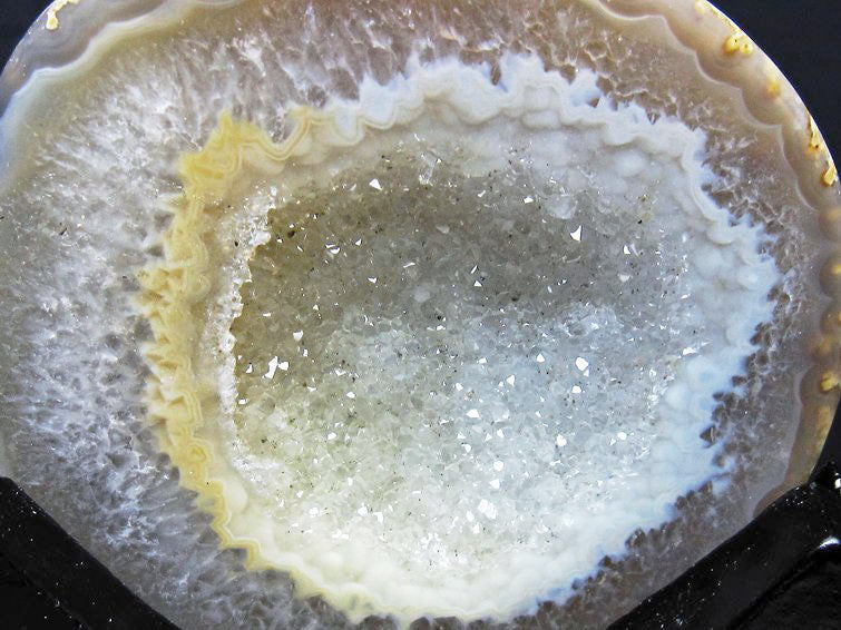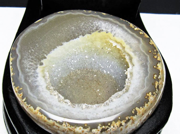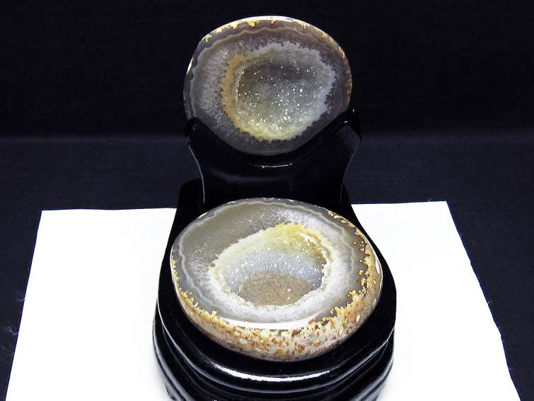 アゲート(瑪瑙)の原石を二つに切ったもので、中には空洞があり、周囲にびっしりと水晶の結晶が並んでいるパワーストーンです。このぽっかりと開いたくぼみ(龍穴)に気が集まるスポットが作り出され、運気上昇に繋がるとされます。龍穴(りゅうけつ)とは、風水における繁栄する土地の事で、龍穴がある場所は天変地異とも無縁であるとされます。