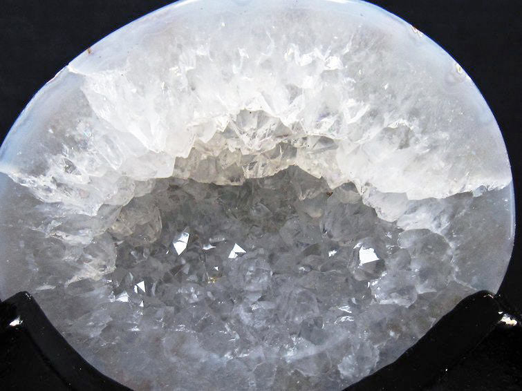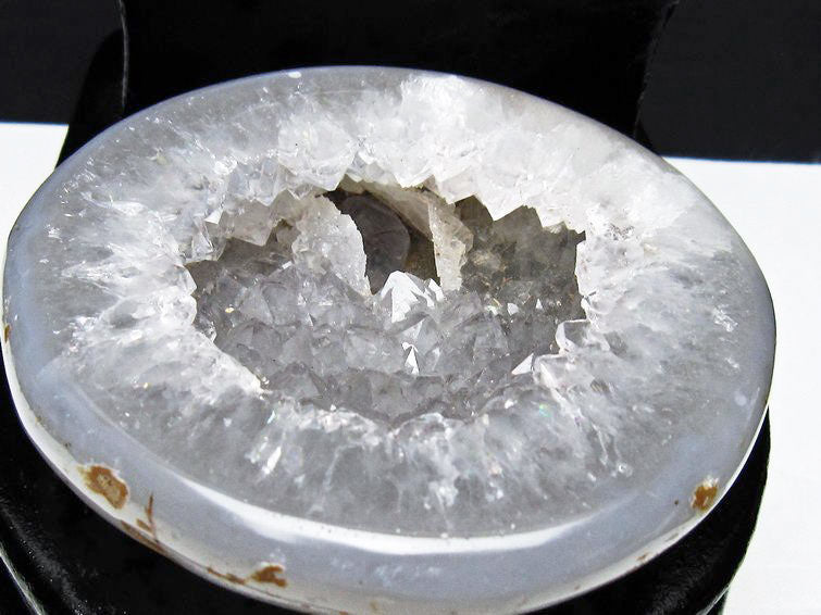 アゲート(瑪瑙)の原石を二つに切ったもので、中には空洞があり、周囲にびっしりと水晶の結晶が並んでいるパワーストーンです。このぽっかりと開いたくぼみ(龍穴)に気が集まるスポットが作り出され、運気上昇に繋がるとされます。龍穴(りゅうけつ)とは、風水における繁栄する土地の事で、龍穴がある場所は天変地異とも無縁であるとされます。