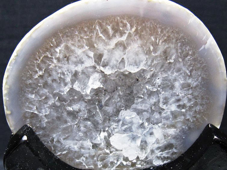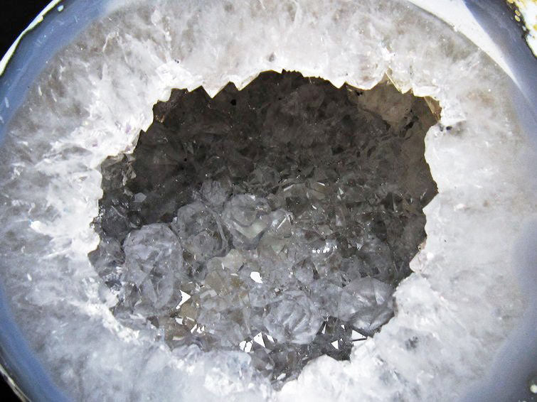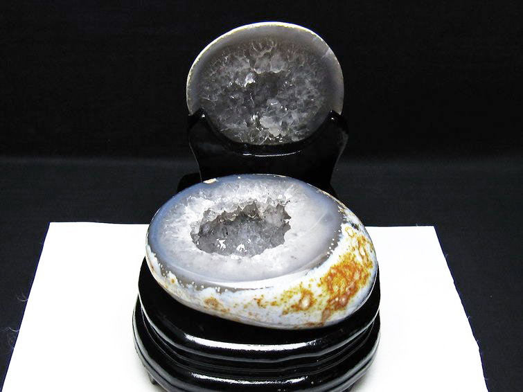 アゲート(瑪瑙)の原石を二つに切ったもので、中には空洞があり、周囲にびっしりと水晶の結晶が並んでいるパワーストーンです。このぽっかりと開いたくぼみ(龍穴)に気が集まるスポットが作り出され、運気上昇に繋がるとされます。龍穴(りゅうけつ)とは、風水における繁栄する土地の事で、龍穴がある場所は天変地異とも無縁であるとされます。