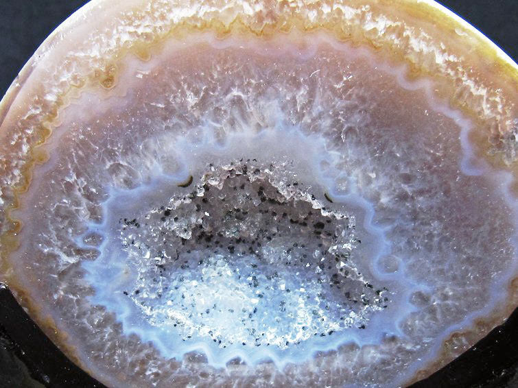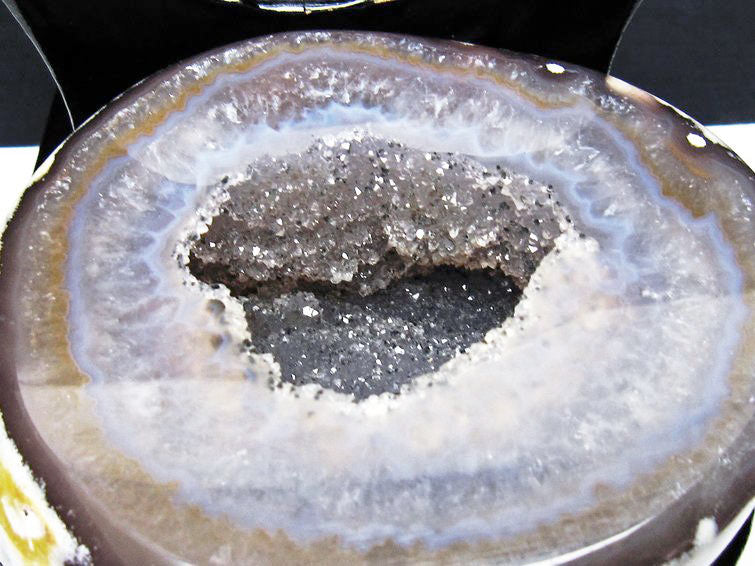 アゲート(瑪瑙)の原石を二つに切ったもので、中には空洞があり、周囲にびっしりと水晶の結晶が並んでいるパワーストーンです。このぽっかりと開いたくぼみ(龍穴)に気が集まるスポットが作り出され、運気上昇に繋がるとされます。龍穴(りゅうけつ)とは、風水における繁栄する土地の事で、龍穴がある場所は天変地異とも無縁であるとされます。